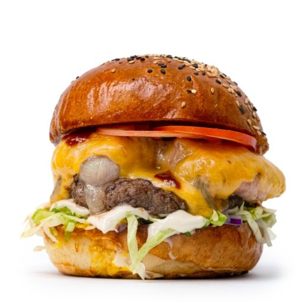 Bulka grilovaná na másle. Mleté hovězí(100g), 3x tvargle, slanina, čedar, rajčátka, salát, cibule, omáčky (bbq, medová majonéza a hořčičný dip).