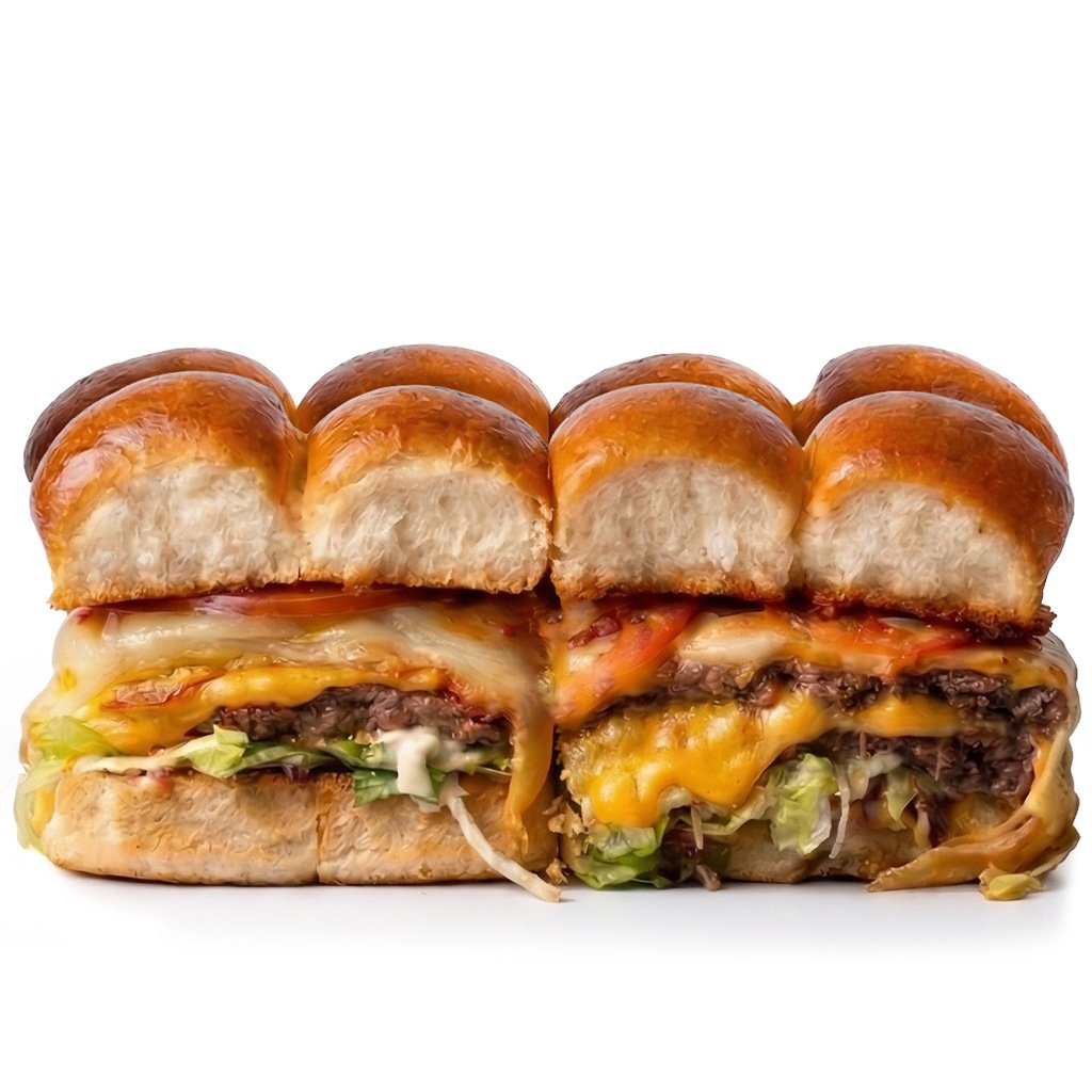 Minis (8ks) bulky grilované na másle. Mleté hovězí(120 g), 8x tvargle, slanina, čedar, rajčátka, salát, cibule, omáčky (bbq, medová majonéza a hořčičný dip). PRODÁVÁME 17.-19.4.2026 1 ks Minis - 78,60,- Kč