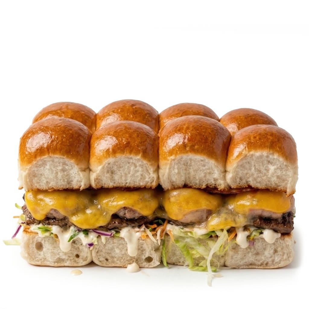 Minis (8ks) bulky grilované na másle. Mleté hovězí (2x 120 g), slanina, čedar, montana, rajčátka, salát, cibule, omáčky (bbq, medová majonéza a hořčičný dip). 1 ks Minis - 57,38,- Kč