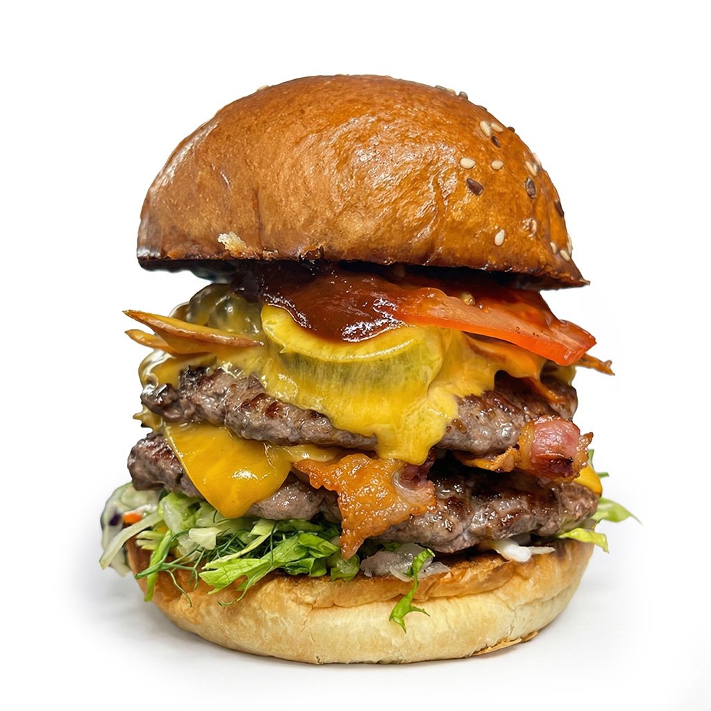 Bulka grilovaná na másle. 2x mleté hovězí (2x 100 g), slanina, čedar, jalapeňos, rajčátka, salát, cibule, omáčky (bbq, medová majonéza a hořčičný dip).
