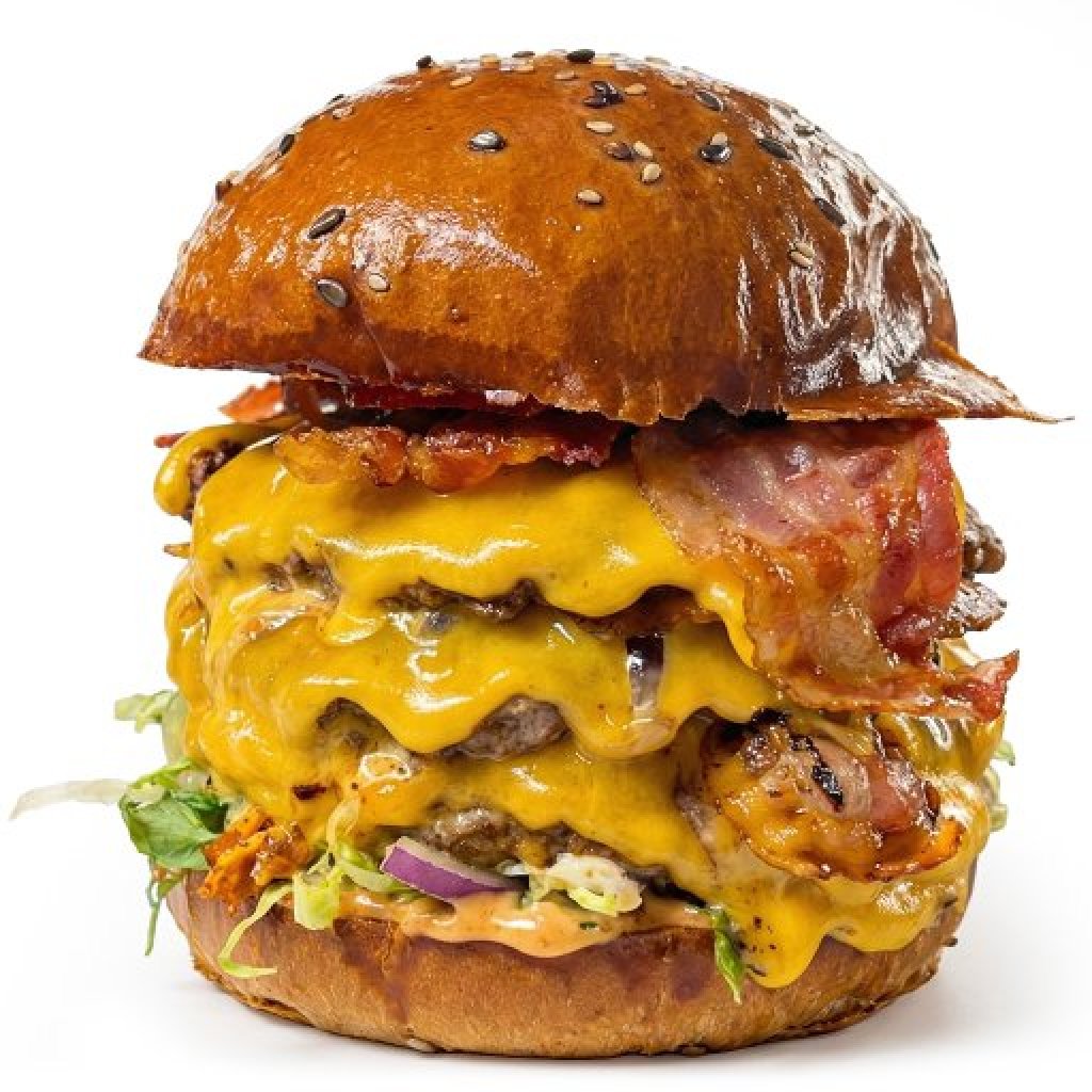 Bulka grilovaná na másle,3x mleté hovězí (3x 100 g), slanina, čedar, rajčátka, salát, cibule, omáčky (bbq, medová majonéza a hořčičný dip).