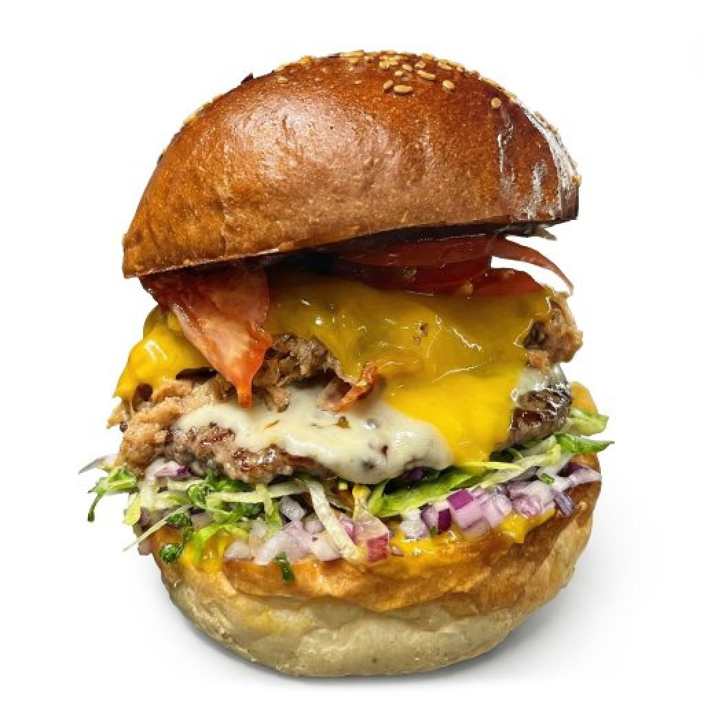 Bulka grilovaná na másle, mleté hovězí (100 g), lehce pikantní trhané vepřové, slanina, čedar, ementál, rajčátka, salát, cibule, omáčky (bbq, medová majonéza a hořčičný dip).