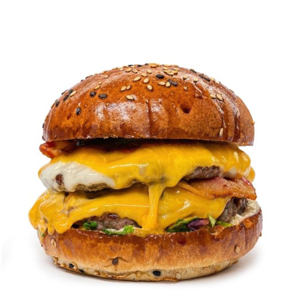 Bulka grilovaná na másle. 2x hovězí maso (2x 100 g), čedar, ementál, rajče, salát, cibule, omáčky (bbq, medová majonéza a hořčičný dip).