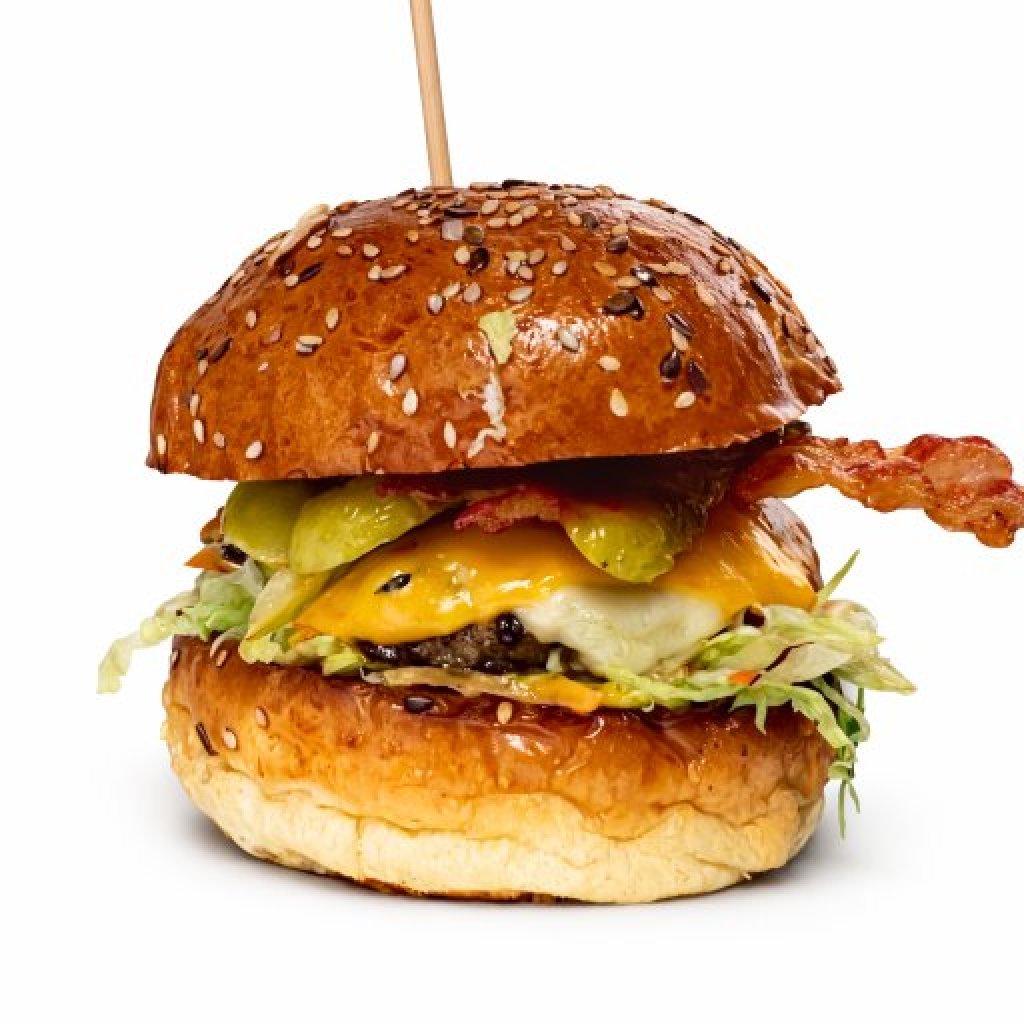 Bulka grilovana na másle, mleté hovězí (100 g), čedar, ementál, okurky, salát, cibule, omáčky - BBQ, medova majonéza a hořčičný dip