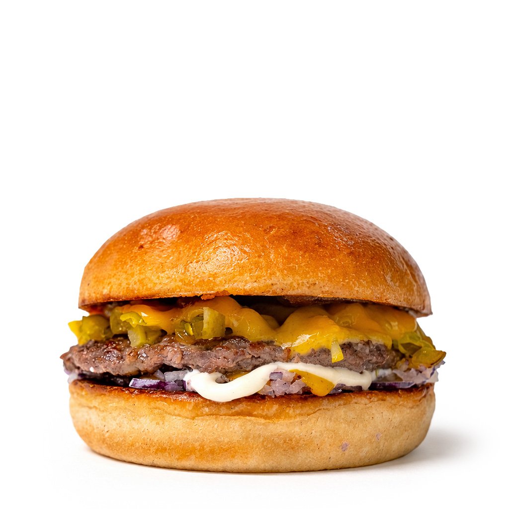 Americká bulka grilovaná na másle, mleté hovězí(65g), čedar, cibule, americké a nakládané okurky, omáčky (medová majonéza, bbq a hořčičný dip).