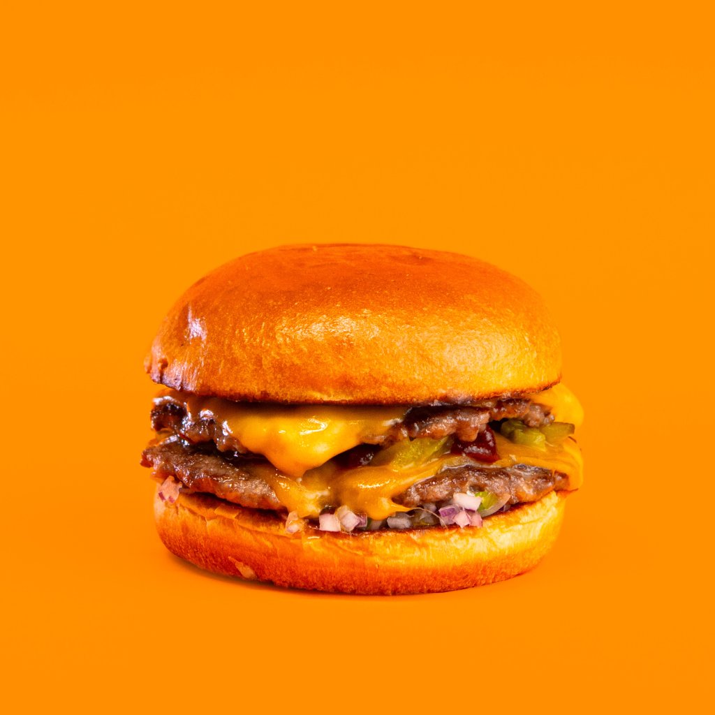 Nová americká bulka grilovaná na másle, 2x mleté hovězí(65g), čedar, cibule, americké a nakládané okurky, omáčky (medová majonéza, bbq a hořčičný dip).