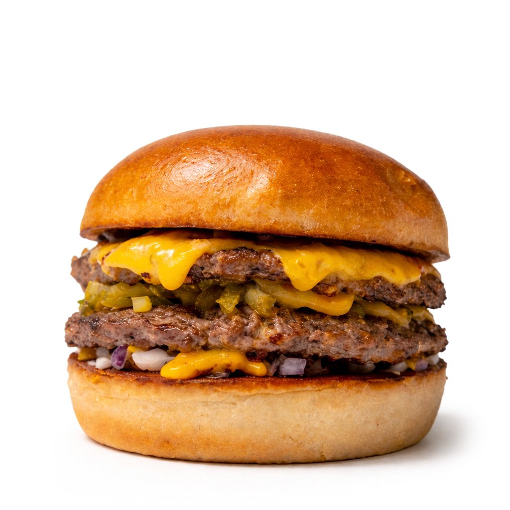 Americká bulka grilovaná na másle, 2x mleté hovězí(65g), čedar, cibule, americké a nakládané okurky, omáčky (medová majonéza, bbq a hořčičný dip).