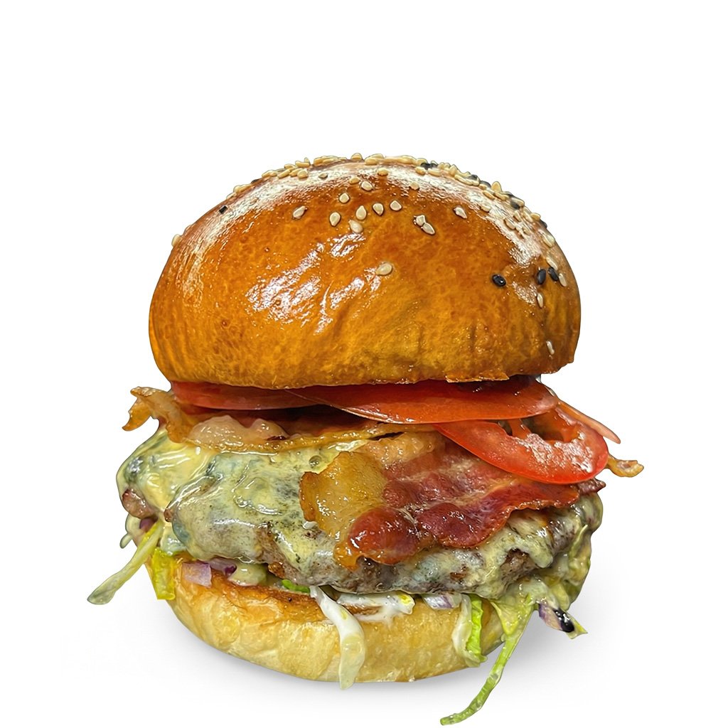 Bulka grilovaná na másle, mleté hovězí maso (100 g), anglický sýr s modrou plísní Blue Clawson Stilton, slanina, rajče, cibule, salát, omáčky (bbq, medová majonéza a hořčičný dip)
